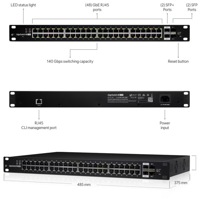 The EdgeSwitch ES-48-750W is 48-Port, Managed PoE+ Gigabit switch with 750W non-blocking throughput switching performance, Gigabit Ethernet RJ45 and SFP+SFP Ports and Auto-Sensing IEEE 802.3af/at PoE. The EdgeSwitch offers an extensive suite of advanced Layer-2 switching features and protocols, and also provides layer-3 routing capabilities.